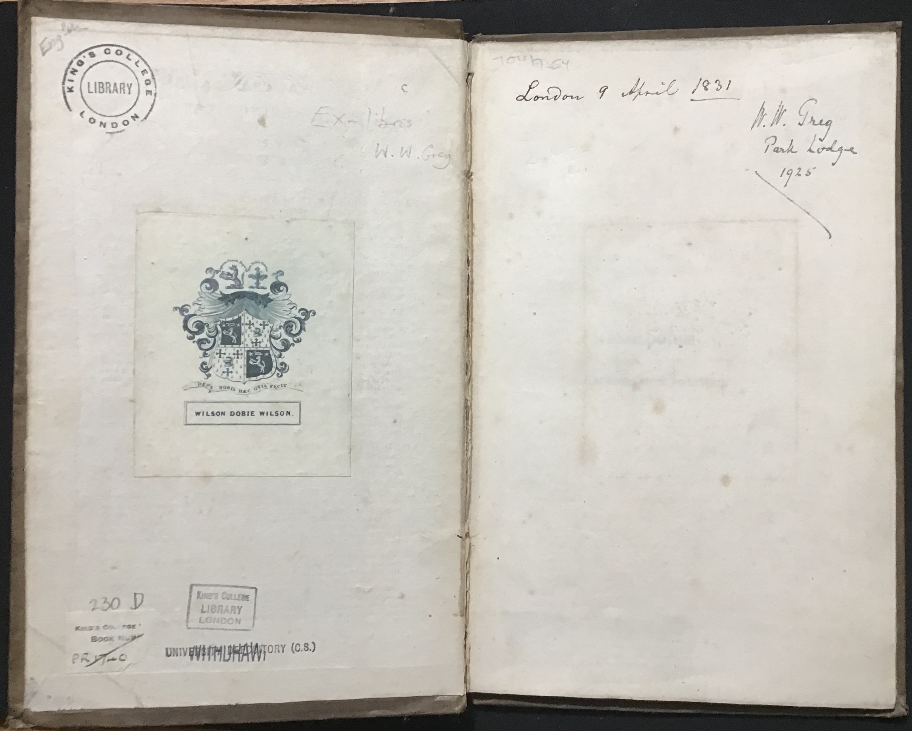 It seems that this copy has changed owners at least three times before coming into my possession. It has a bookplate of someone called Wilson Dobie Wilson (possibly a Scottish author, editor and traveller who lived between 1803-1838), who perhaps bought the copy in London on 9 April 1831. In 1925, the book came into possession of Walter Wilson Greg (1875-1959), a reputed independent Shakespeare scholar, and then came into possession of the library of King's College, London, from which it was withdrawn perhaps in the late twentieth or early twenty-first century.