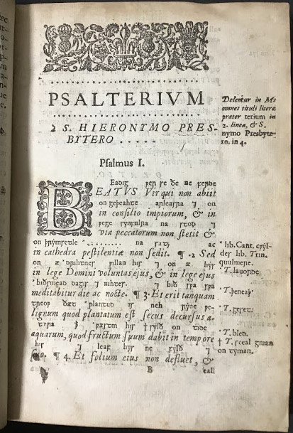 The main text in this manuscript is a Gallican Psalter (in Latin), to which Old English interlinear glosses are added above each line. In the edition, Spelman follows the original and prints not only the Latin text but also the Old English glosses, while (understandably enough) omitting all the decorations.