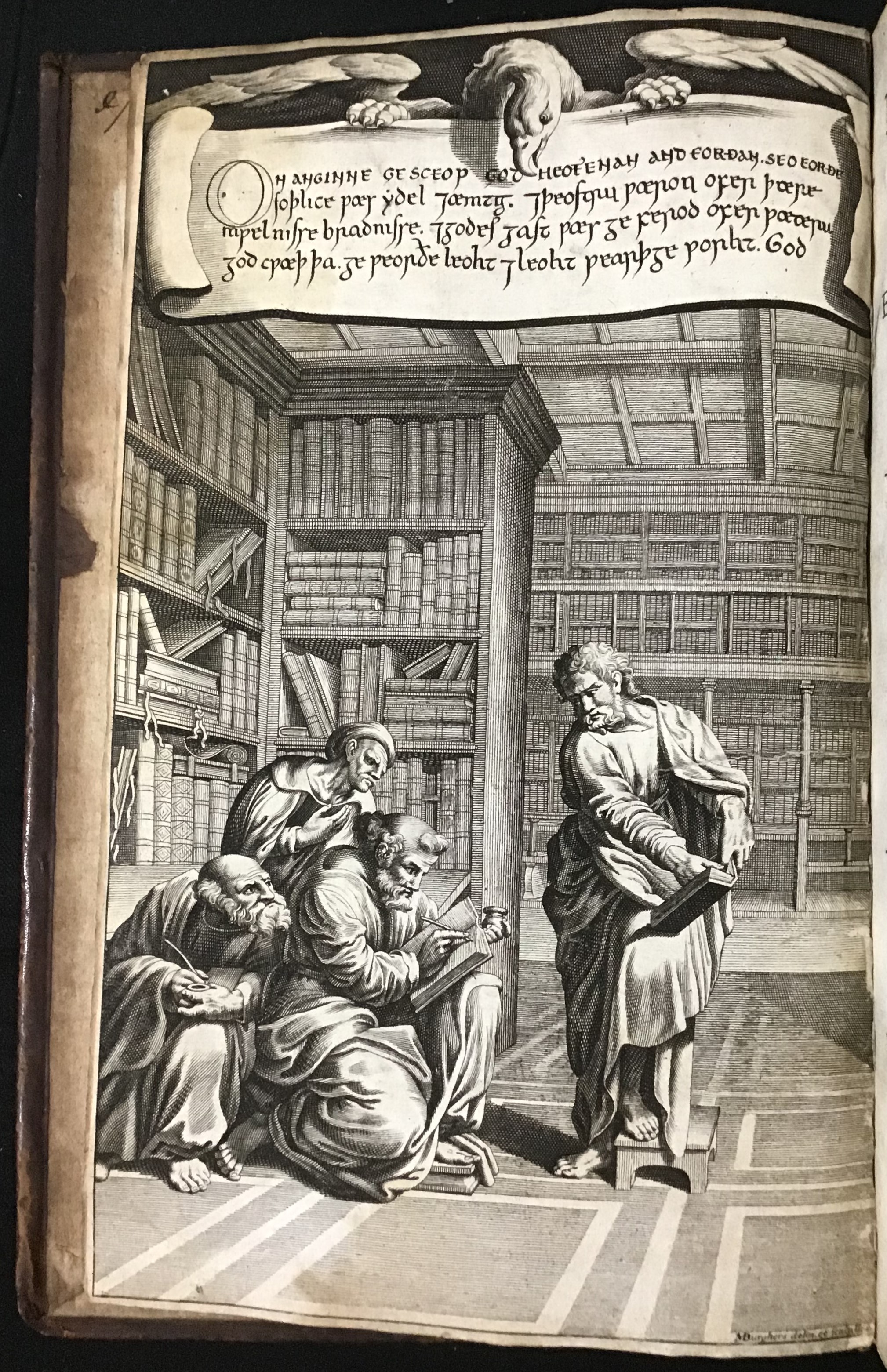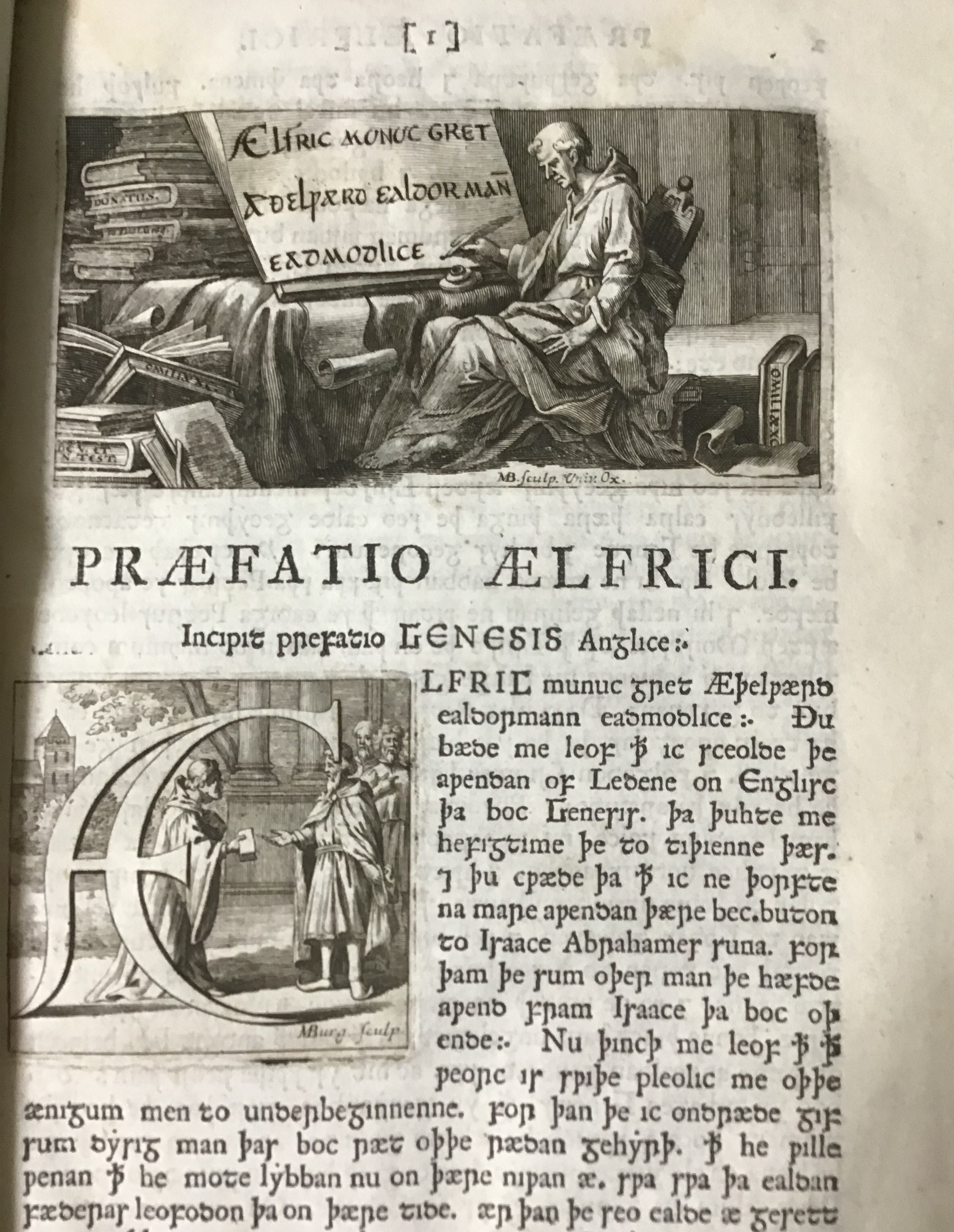 Preceding the title page, there is a full-page print of a scene of a 'lecture' in a library, at the top of which the beginning of Ælfric's Old English translation of Genesis is quoted. At the top of the page in which Ælfric's preface to his translation of Genesis begins, a print depicting Ælfric writing down the first words of the preface is inserted, while the preface itself begins with a large capital Æ in a miniature in which Ælfric hands a book to Æthelweard, at whose request Ælfric reluctantly translated these texts from the Old Testament.