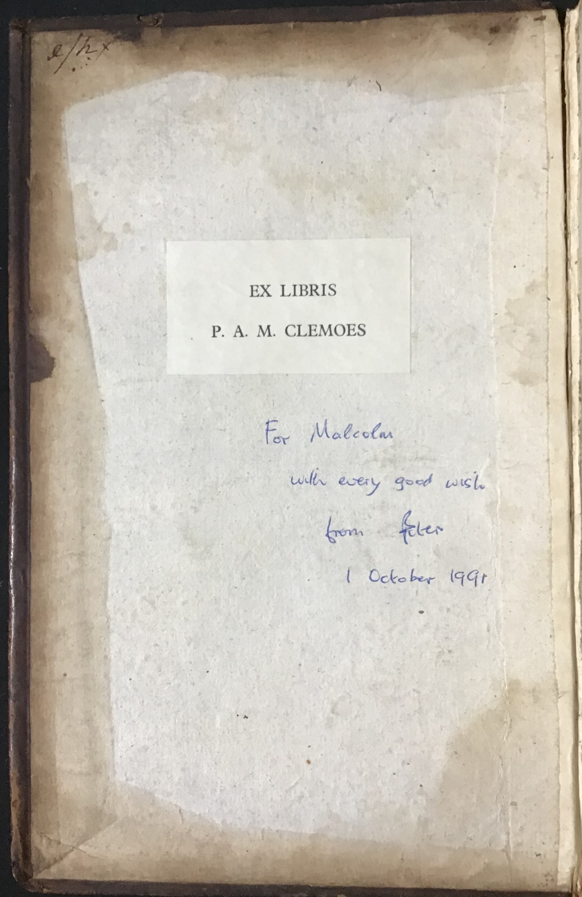 My copy used to belong to the late Peter Clemoes (1920-1996), former Elrington and Bosworth Professor of Anglo-Saxon at the University of Cambridge, who gave it on 1 October 1991 to Malcolm Godden, former Rawlinson and Bosworth Professor of Anglo-Saxon at the University of Oxford (perhaps congratulating him on his accession to the highly distinguished professorship at Oxford in the same year?). Both professors are editors of Ælfric's Catholic Homilies, Early English Text Society, Supplementary Series, nos. 5 (Second Series edited by Godden) and 17 (First Series edited by Clemoes).