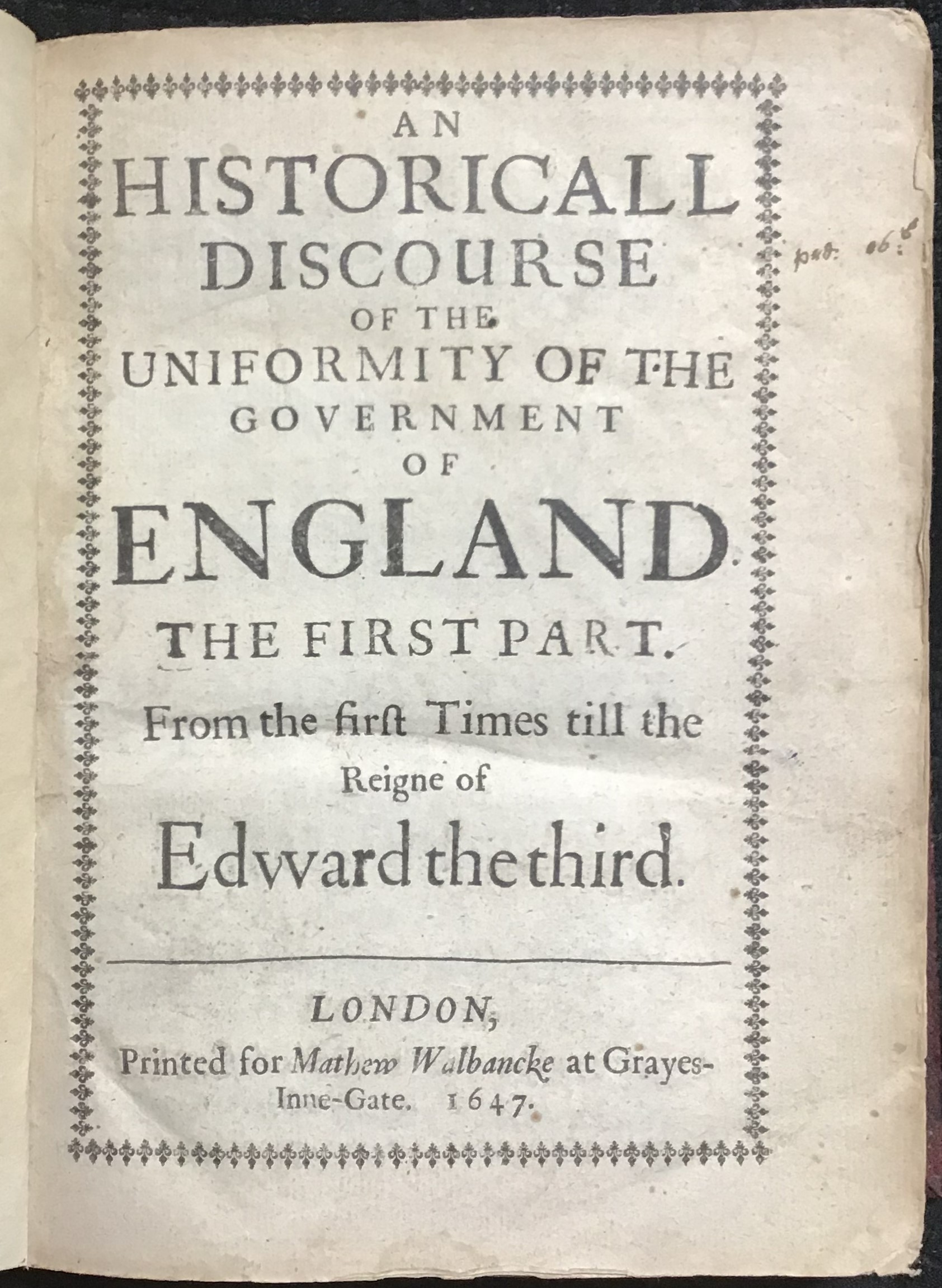 N. Bacon, An Historical Discourse of the Uniformity of the Government of England (1647)