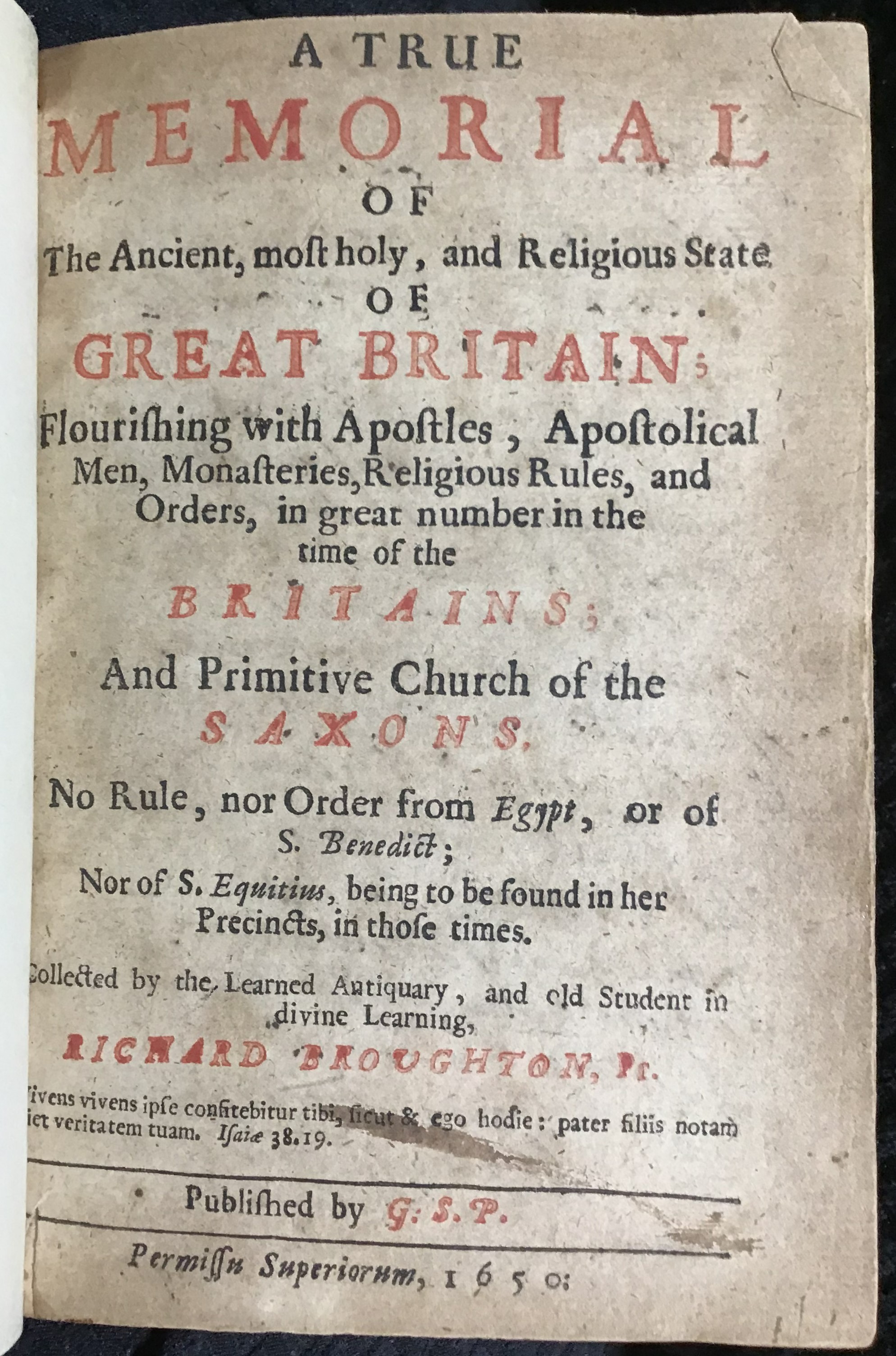 R. Broughton, A True Memorial of the Ancient, Most Holy, and Religious State of Great Britain (1650)