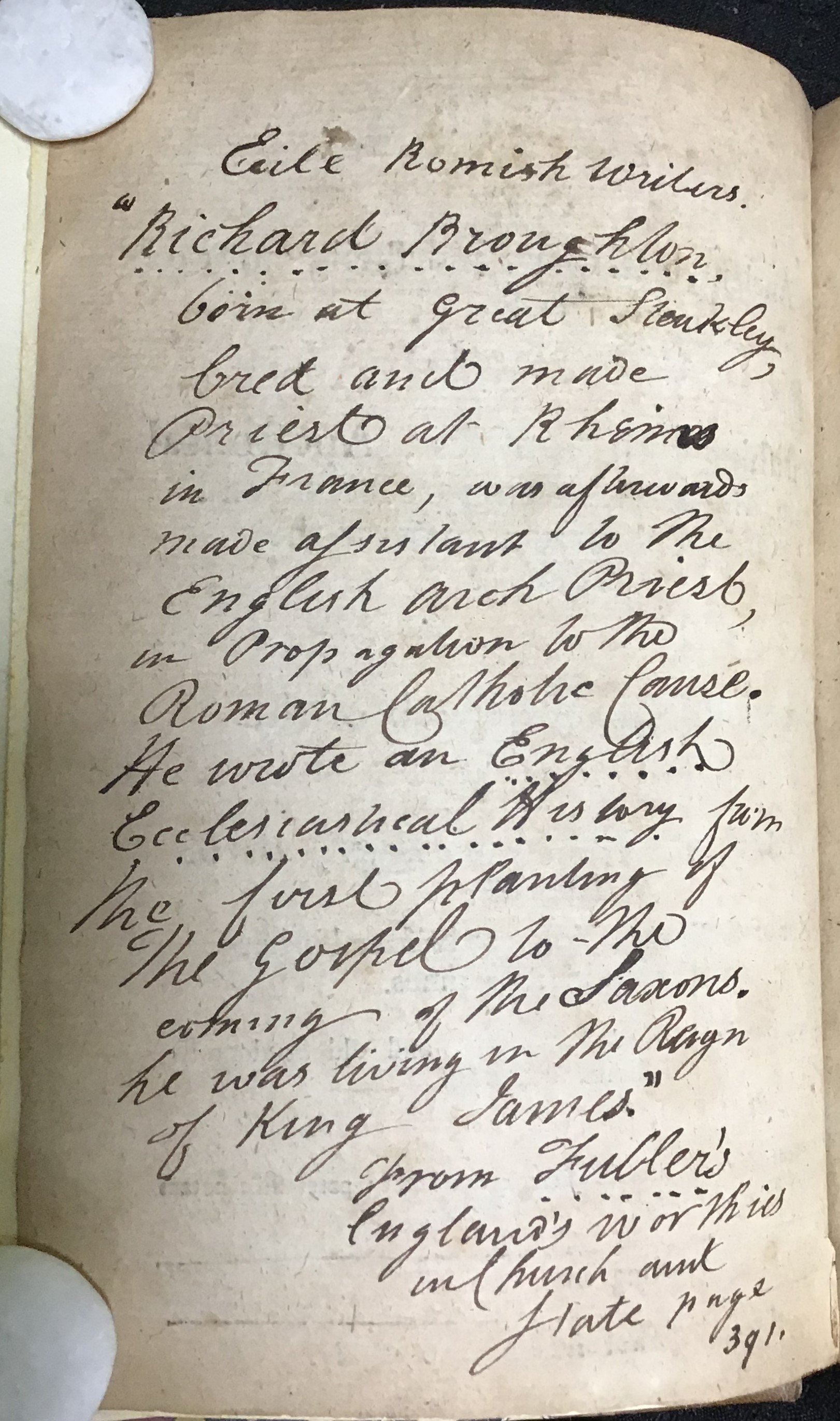 My copy is rebound in a modern binding and it has no signatures or bookplates of previous owners, but one of them left a note on the author, quoting words from Thomas Fuller's History of the Worthies of England (1622).