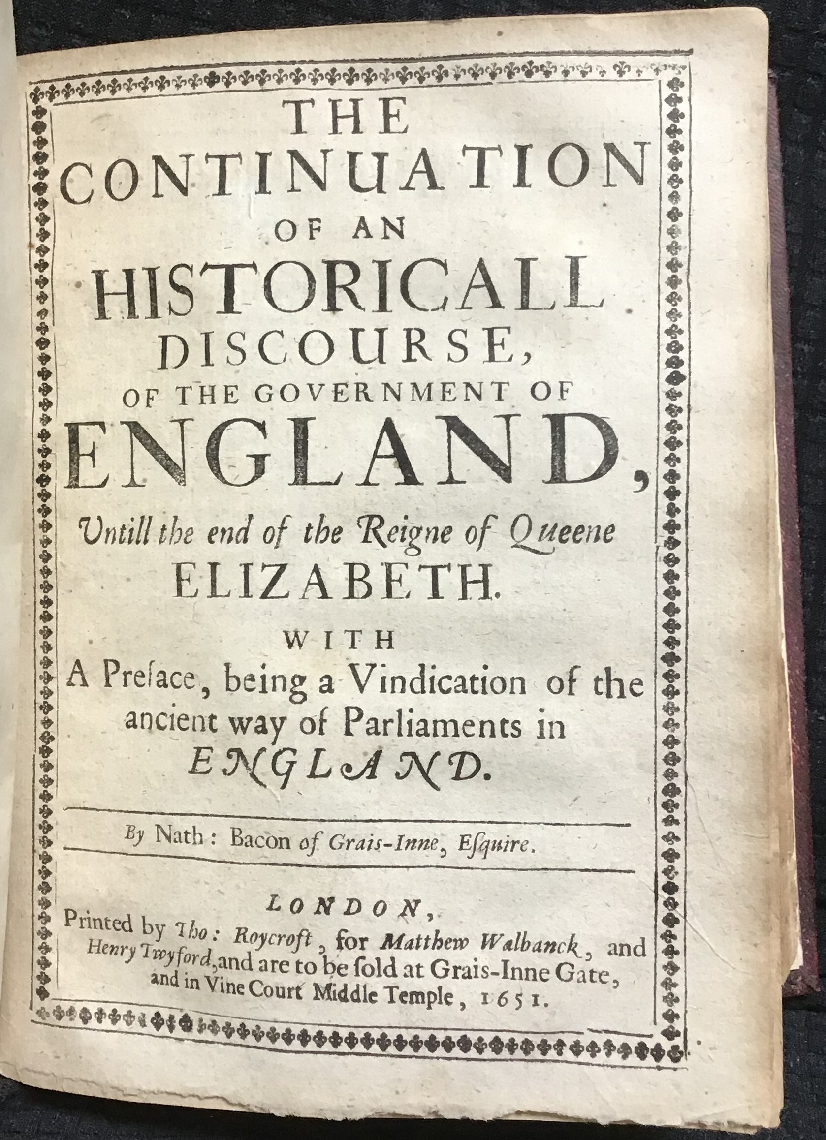Nathaniel Bacon, The Continuation of an Historical Discourse of the Government of England until the End of the Reigne of Queene Elizabeth with a Preface, being a Vindication of the Ancient Way of Parliaments in England (London, 1651).