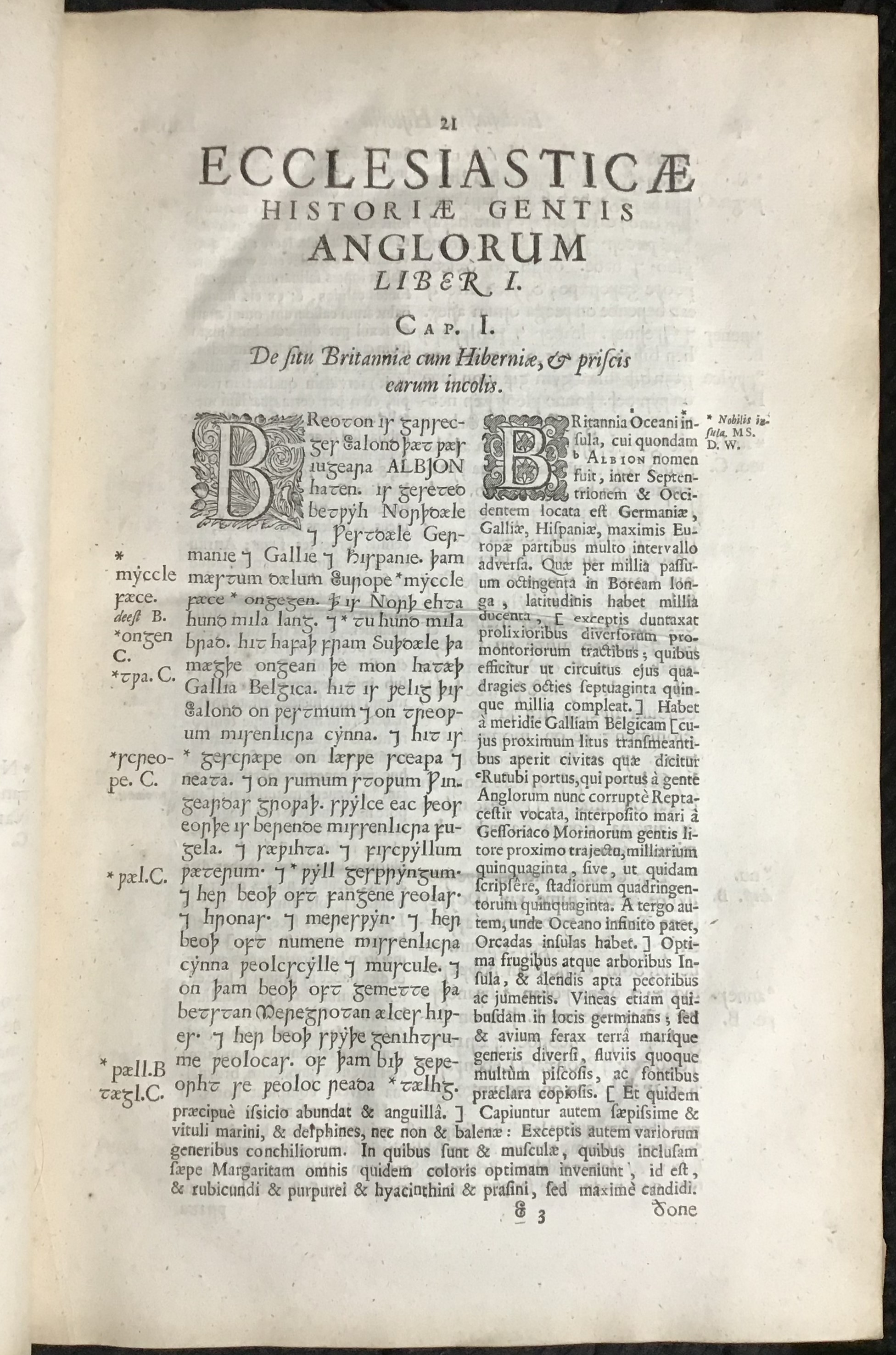 Among many texts included in this volume, the most notable are the editiones principes of the Old English Bede (as Douglas writes 'Wheloc's work on Bede was to an especial degree important' (p. 62)) and the Anglo-Saxon Chronicle. The text of the Old English Bede is based on three manuscripts, while that of the Anglo-Saxon Chronicle is chiefly based on the manuscript, BL Cotton Otho B.xi, which was largely destroyed in the fire at the Cotton Library in 1731. The Old English Bede is accompanied by its Latin original, while the Anglo-Saxon Chronicle is presented with a Latin translation.