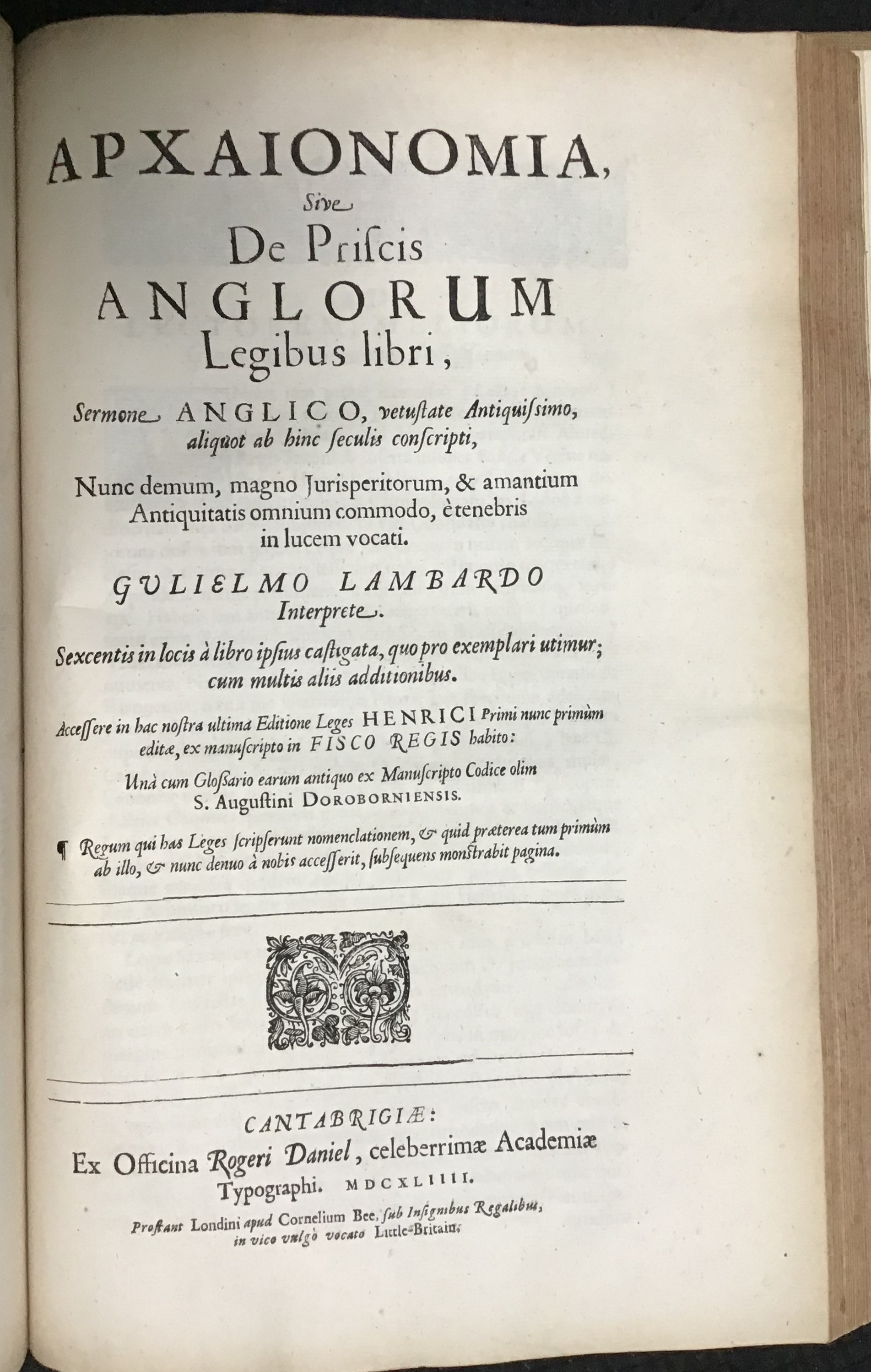 The first edition of this book was published in 1643, while this volume, published in the next year, is a reissue of the same book with the addition of William Lambarde's Archaionomia (1568), a pioneering collection of Anglo-Saxon laws and treatises with Latin translation, including the laws of Edward the Confessor and William I.