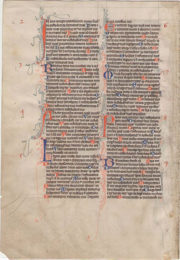 It is 214mm tall and 145mm wide, written in Latin in minute gothic book-hand script in brown ink, and is beautiful with rubricated chapter numbers, initials and marginalia in red and blue. The text on this leaf begins with Psalm 113.14 and ends with Psalm 118.71. On the whole, it is a very nice leaf to have in my study, and is by far the oldest thing that I have at home.