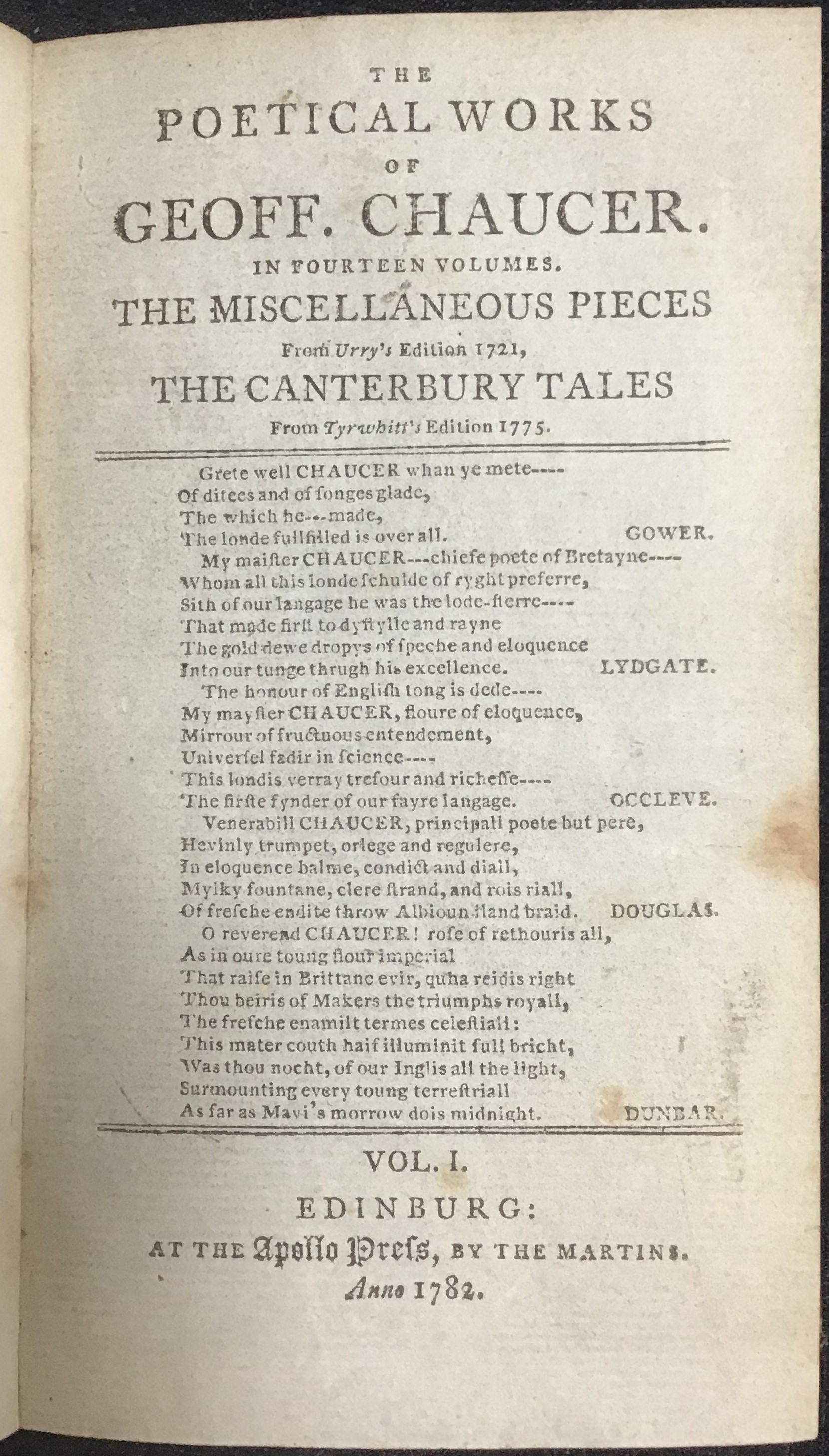 This is a very small, iPhone-sized collected edition of works by Geoffrey Chaucer, and is part of John Bell's Poets of Great Britain series. The text of The Canterbury Tales is based on Thomas Tyrwhitt's edition published in 1775, while the other works' texts are based on John Urry's published in 1721. On the title pages of all the fourteen volumes, eulogies on Chaucer by John Gower, John Lydgate, Thomas Hoccleve, Gavin Douglas, and William Dunbar are printed, which is a bit unusual.
