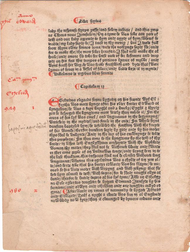 Main body of the text on the leaf is printed in black, while orange capitals, paragraph marks, and inscriptions on the margin are added by a contemporary hand (the name of King Edward the Martyr in orange occurs once each on the margin of each page and that of King Æthelred the Unready once on the margin of the verso page). Another, seemingly later, hand adds some inscriptions in black on the margin too.