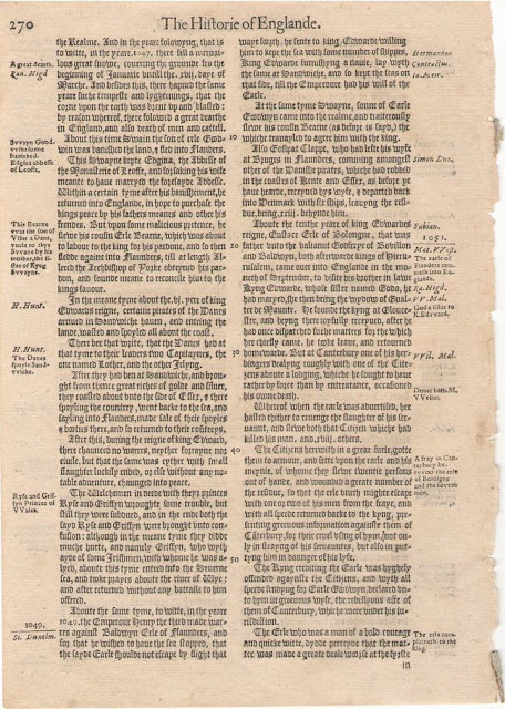 This is a leaf (pp. 269-70) from the first volume of Raphael Holinshed, The Chronicles of England, Scotland and Ireland, 2 vols. (London: Lucas Harrison, 1577).