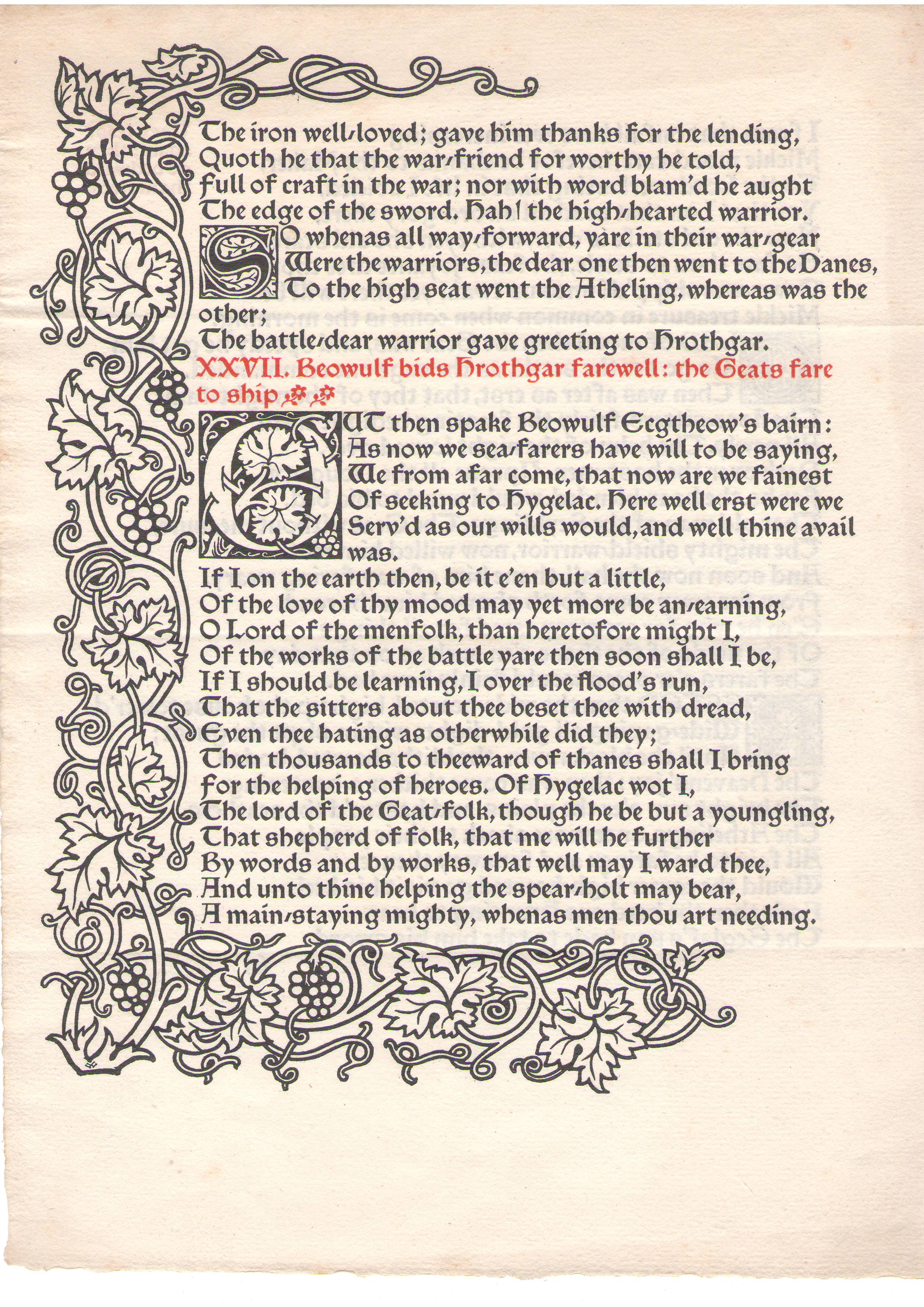 As a lover of medieval literature, William Morris studied medieval manuscripts and early prints, produced illuminated manuscripts, and translated several works into English. In his later years, in 1891, Morris established a private press called Kelmscott Press (named after the Oxfordshire village Kelmscott but located in Hammersmith), and published many beautiful books in a style of an illuminated manuscript. The Tale of Beowulf is one of them, and only 300 copies were made (8 copies were printed on vellum). The above is a specimen leaf from it, covering lines 1777-1835 of the original.