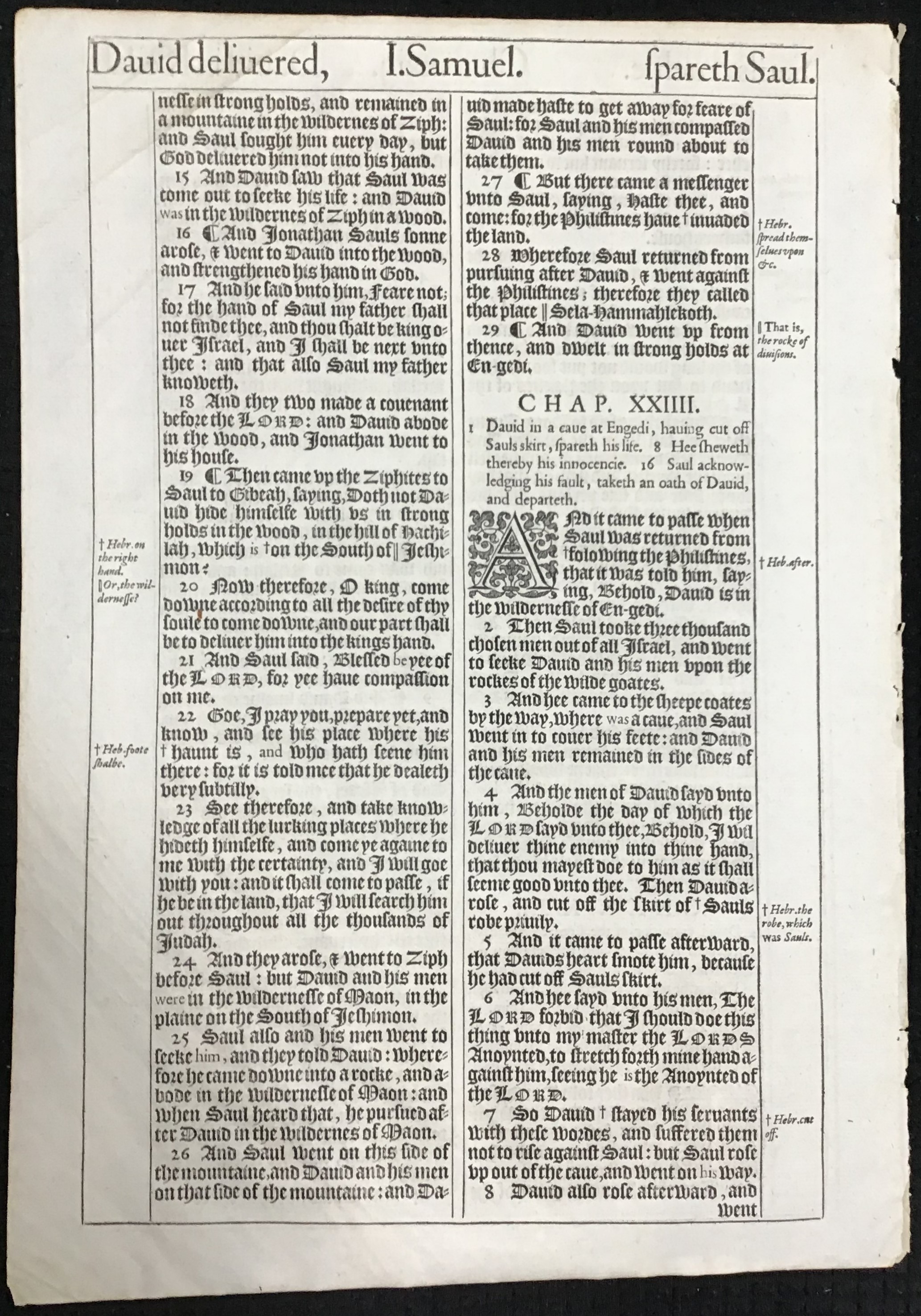 The following is a leaf from the King James Version (aka Authorised Version) published in 1611. It covers I Samuel 22.15-24.8.