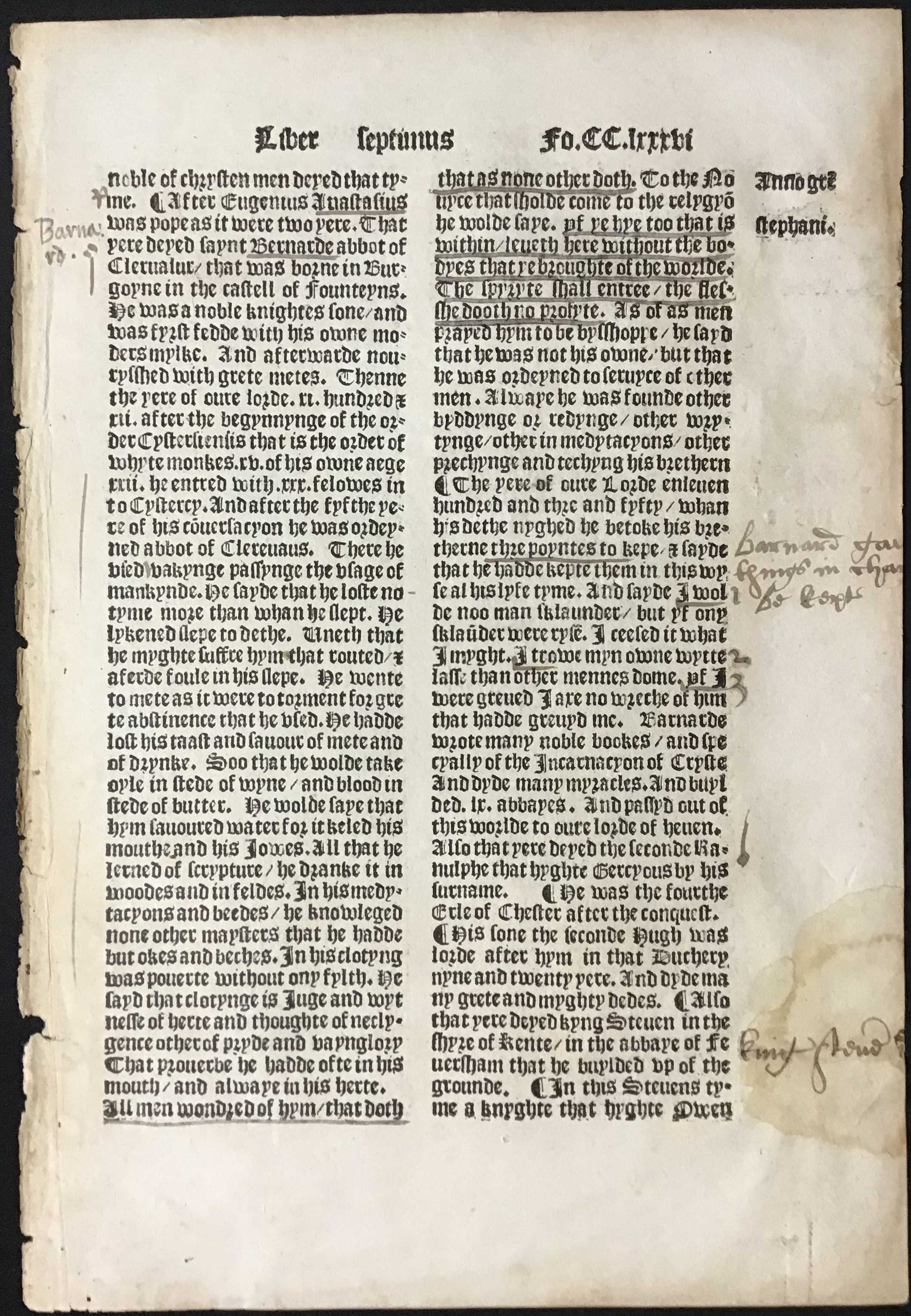 This leaf contains a woodcut initial, and covers from the last part of Book 7 Chapter 21 to the beginning of the next chapter, from 1153 to 1155, and mentions the death of St Bernard, the death of King Stephen, and the accession of King Henry I. It also includes some contemporary marginal notes and underlining in ink.